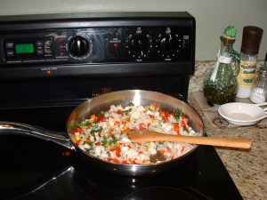 Saute veggies til onions are clear. (There are no streaks that became visible with the bright flash of light. That is an illusion. My stove is spotless.)